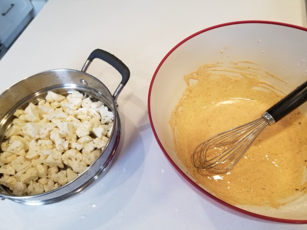 First we are going to make the buffalo cauliflower. I’ve chopped up a half a head of cauliflower into smaller than bite-size pieces. In the big bowl I have flour, corn starch, water, salt, pepper, smoked paprika, and garlic powder. Now it’s just a matter of combining the two!