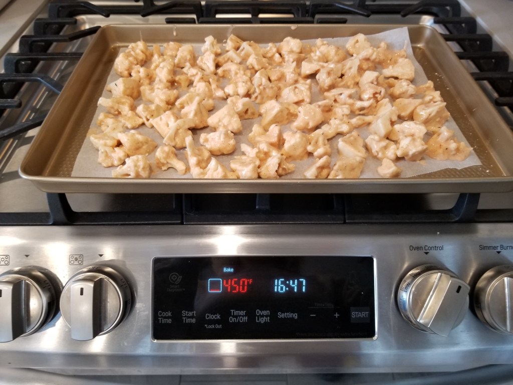These will go in the oven for about 20 minutes to cook through. Point of self-criticism: make sure there is enough physical separation between each cauliflower piece because some of mine stuck together when the batter pooled. (See bottom right corner.)
