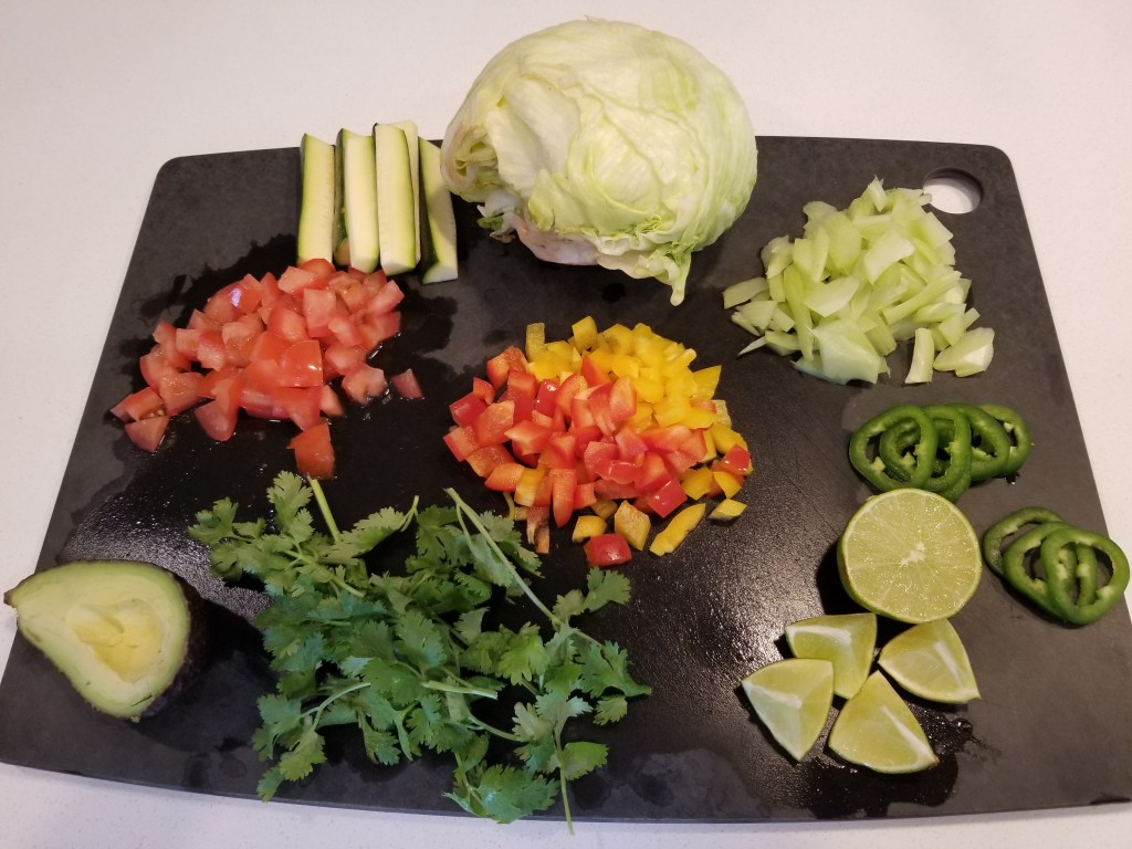 In this pic I have tomatoes, red and yellow peppers, lettuce, zucchini, celery, jalapenos, lime, cilantro, and avocado. (Not shown: red onion, sour cream, and mozzarella.)