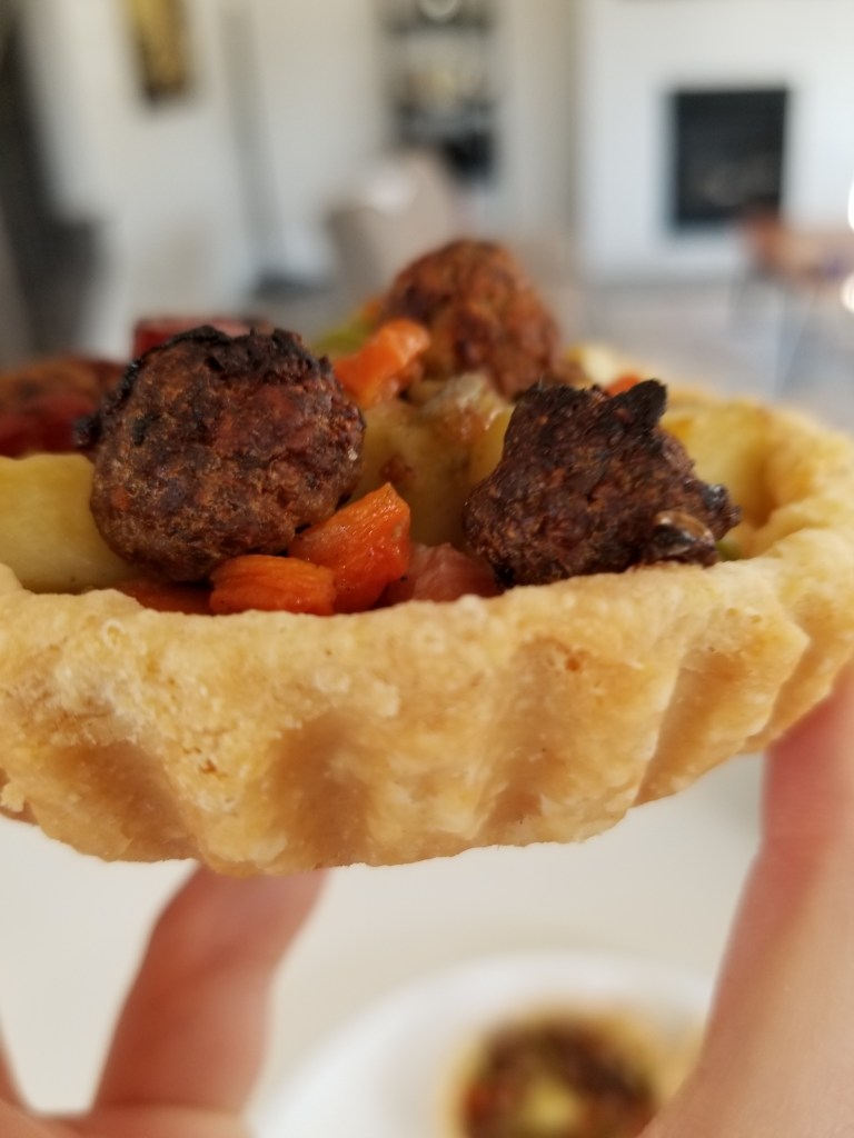 Here I am trying my hand at making small things: small meatballs, small tartlets. I know this picture is deceiving because it’s such a close up. Take a look at the pic below to get a better idea of the scale.
