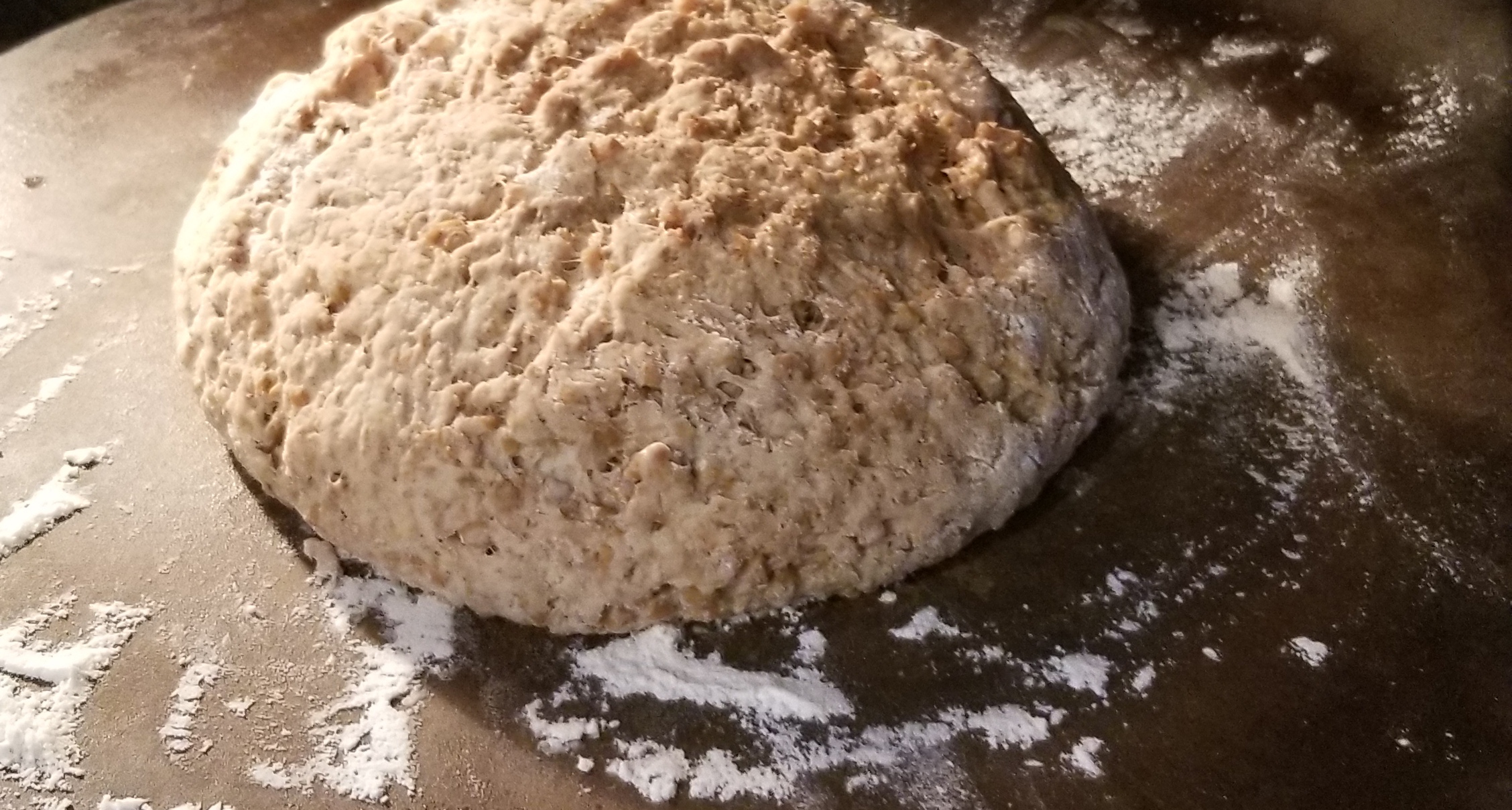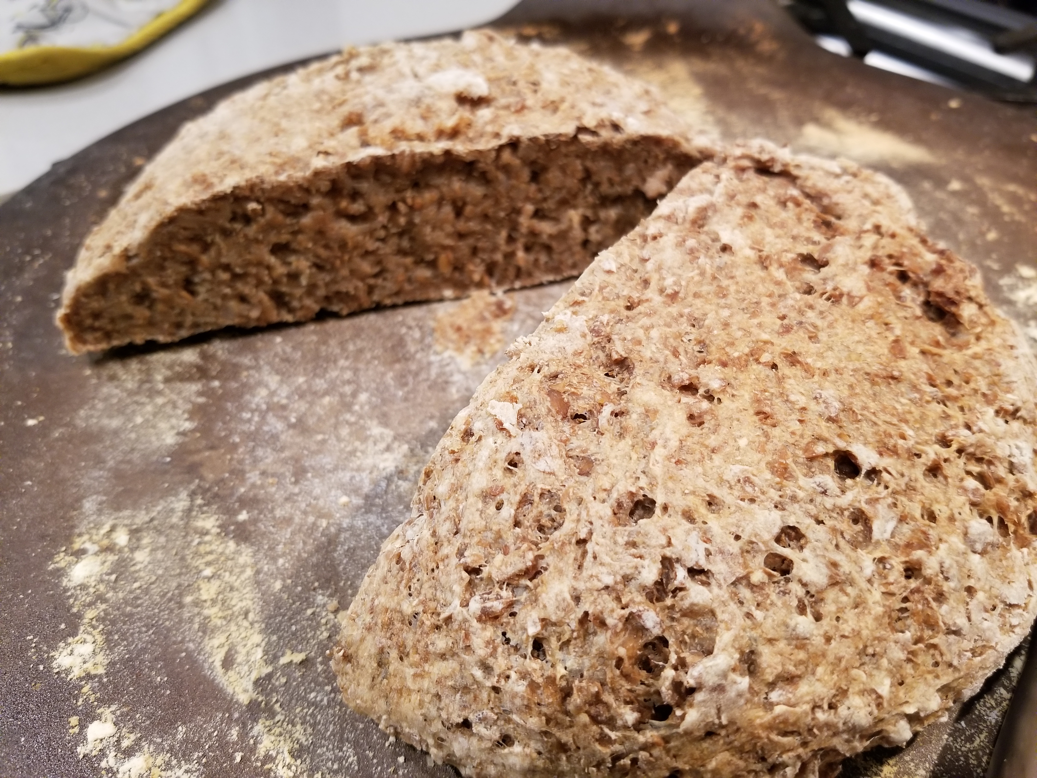 I used the cooked grains from the grain sock, and drained off the excess liquid. I then spread the cooked grains out flat on a tray so that they could cool. From there, I added ~2 Cups of whole wheat flour and one cup of all-purpose white flour, one tablespoon of granulated sugar, and 2 teaspoons of dry active baker’s yeast. I left the loaf to rise in close proximity to the heat of my oven for about 6 hours. I knew that the rising time would need to be doubled than when I normally make bread since this had still so much moisture in it. Eventually it did have enough loft in it that I could manipulate it onto a pizza stone. I shaped a round loaf and cooked it at ~415°F for approximately 30 minutes. The flavour was surprisingly pleasant and reminiscent of oatmeal, and the crumb had a soft texture which was likely the result of using cooked grains as opposed to mixing them in dry, adding liquid, and allowing for a longer proofing time.