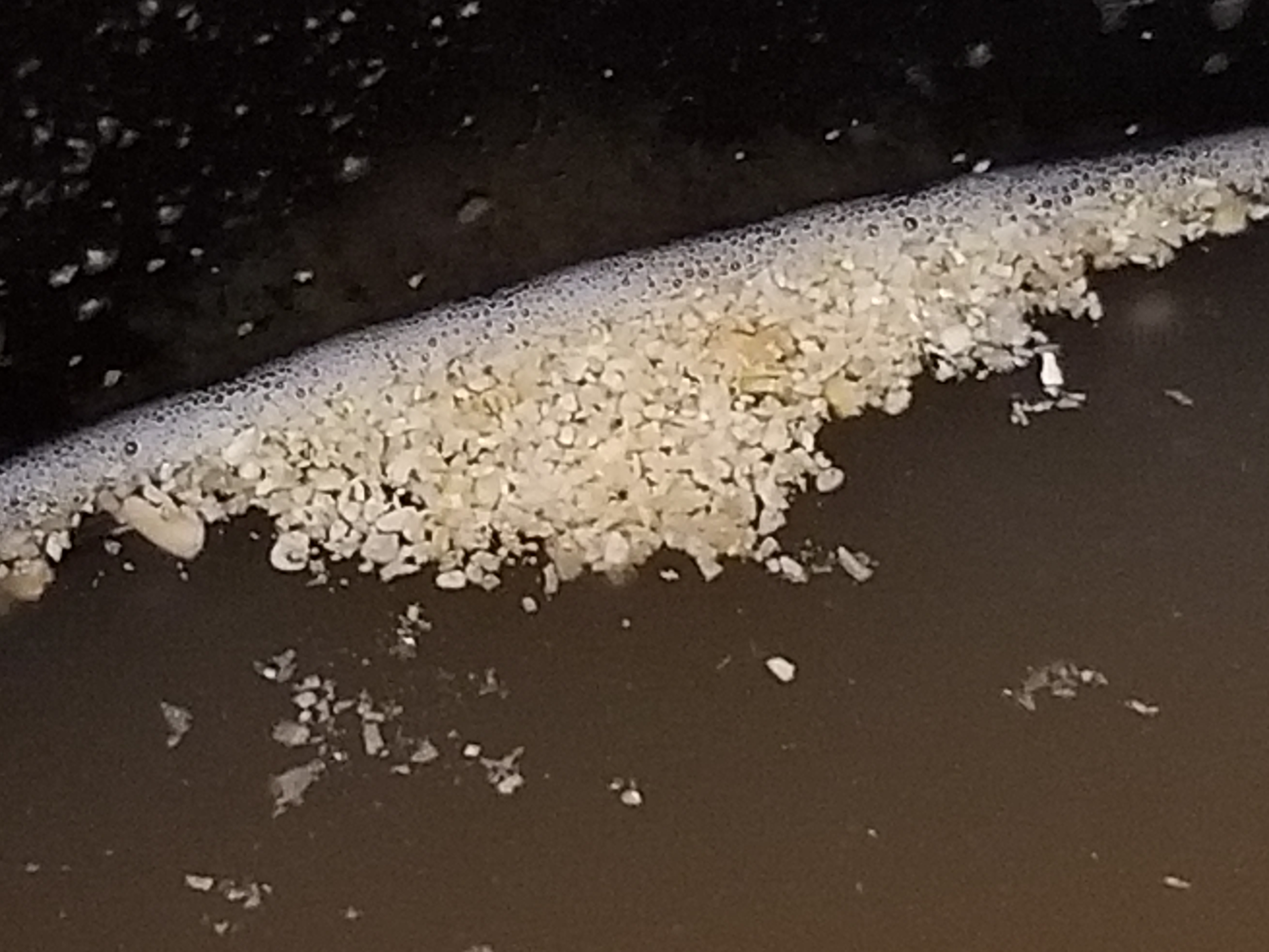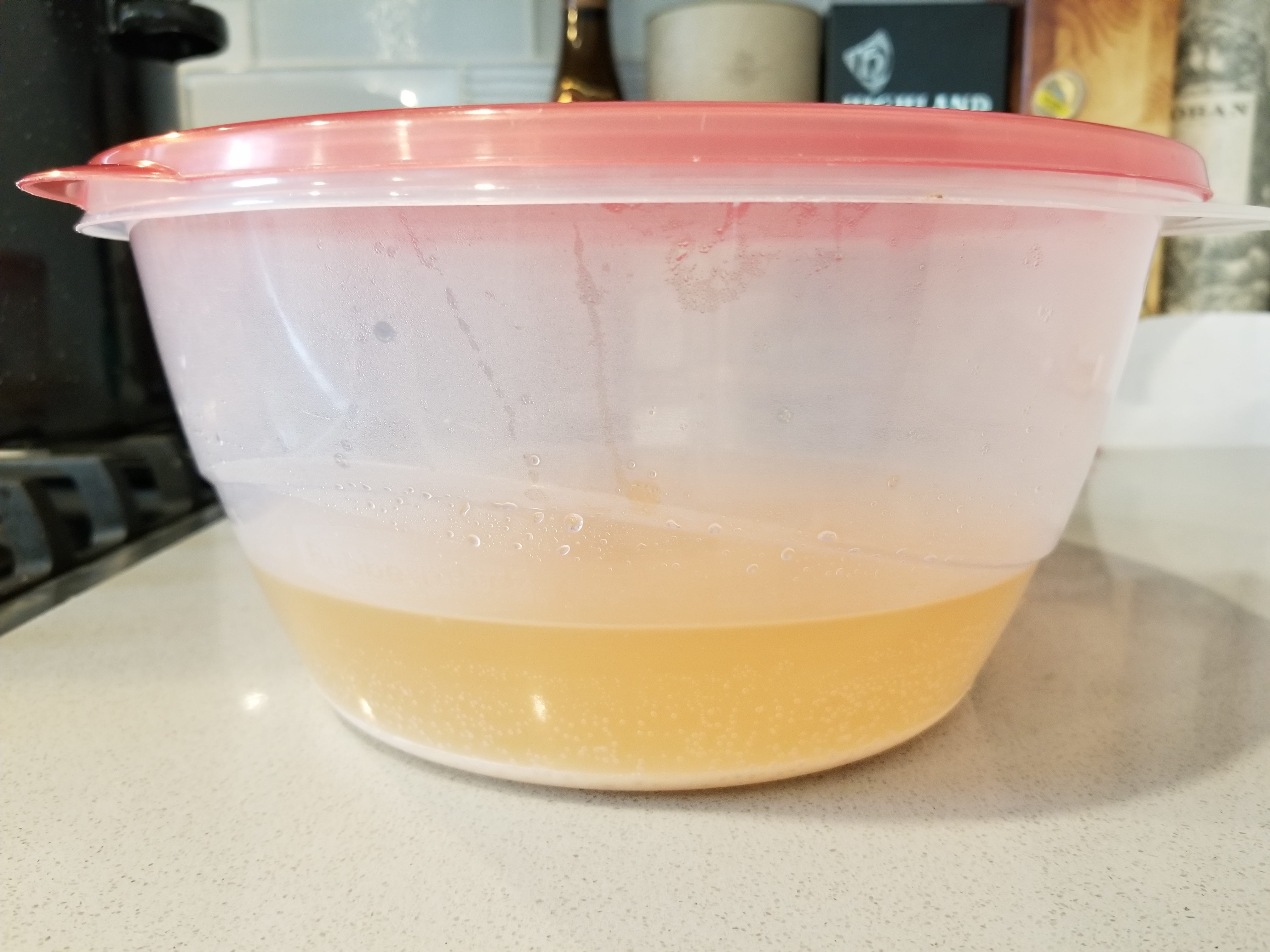 I opted for vigorous whisking instead for my aeration, doing this intermittently for 2 or 3 hours. When not being stirred, the beer stayed covered with the lid and sat on the stovetop. Along this process, there have been several times where I had to interpret the historical records in order to come up with a modified brewing plan. This would come to a head when I needed to decide how to ferment the beer and kill the yeast. Without knowing the alcohol content, I couldn’t really pick a right time to do this. I am also inclined to infer that the ancient Sumerians likely lacked the ability to vacuum seal their beer vats. This could have been done to some extent if clay was pressed around the openings of their earthenware. At this point I decided to divide my beer between two vessels: the original cooking pot, and a large bowl Tupperware. This way, I could observe the changes between the two. I left each beer divide for two days covered and undisturbed. After two days, it was obvious that the Tupperware version had resisted continued yeast growth, where the brew pot had obvious yeast (and other) growth on its surface. I had to assume at this point that the Tupperware beer, with its mostly sealed environment, had successfully stopped the yeast growth.