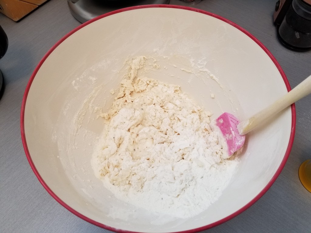 Mix all dry ingredients first in a large bowl. In a separate bowl, dissolve your yeast in the warm water by stirring until you have a slurry of brown water. Add the wet to the dry until a sticky dough starts to form. Now add the olive oil (this will keep things from sticking too much to your hands or spatula).