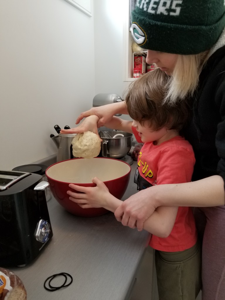 Eventually you will get to a point where you need to knead the dough. Some people insist on doing this on a countertop, but that makes a mess and isn’t super necessary. If your bowl is big enough, do it right there. Kneading , hitting, slapping your dough ball for about five minutes. Kees likes to help with the hitting parts.