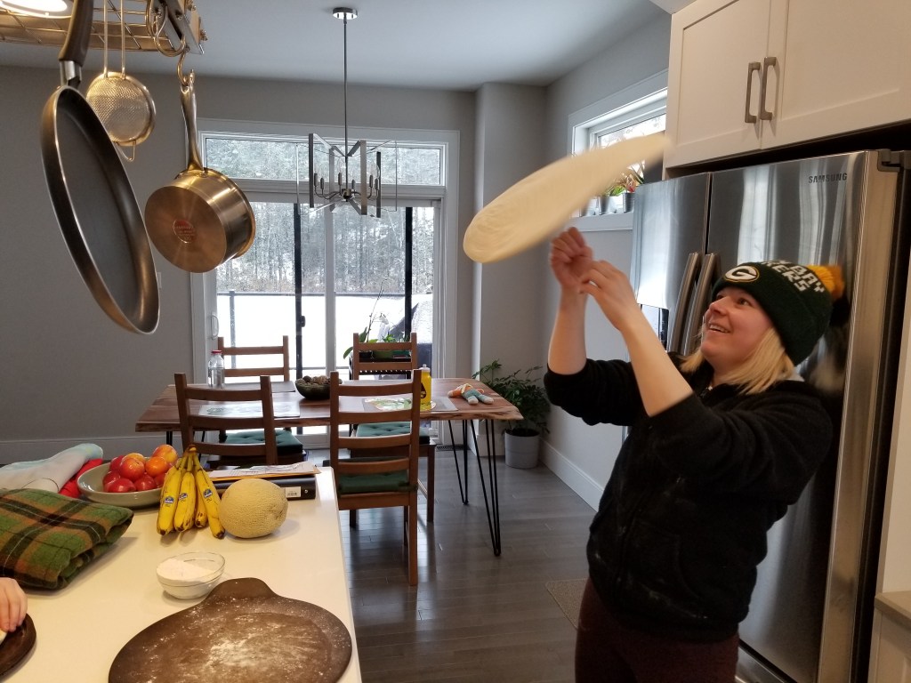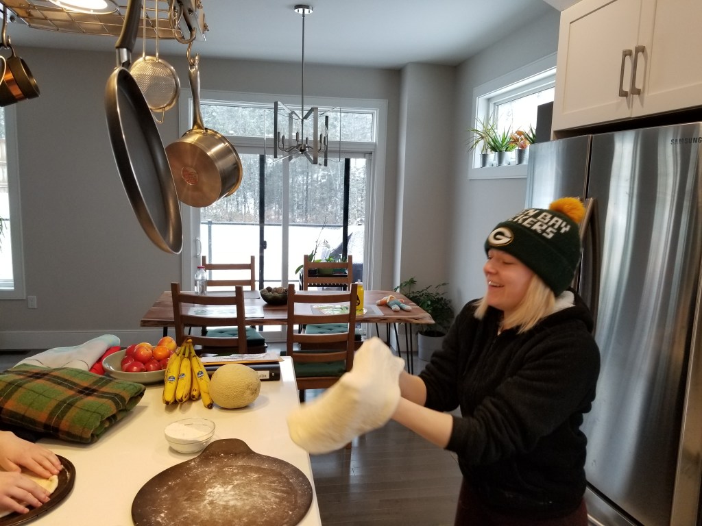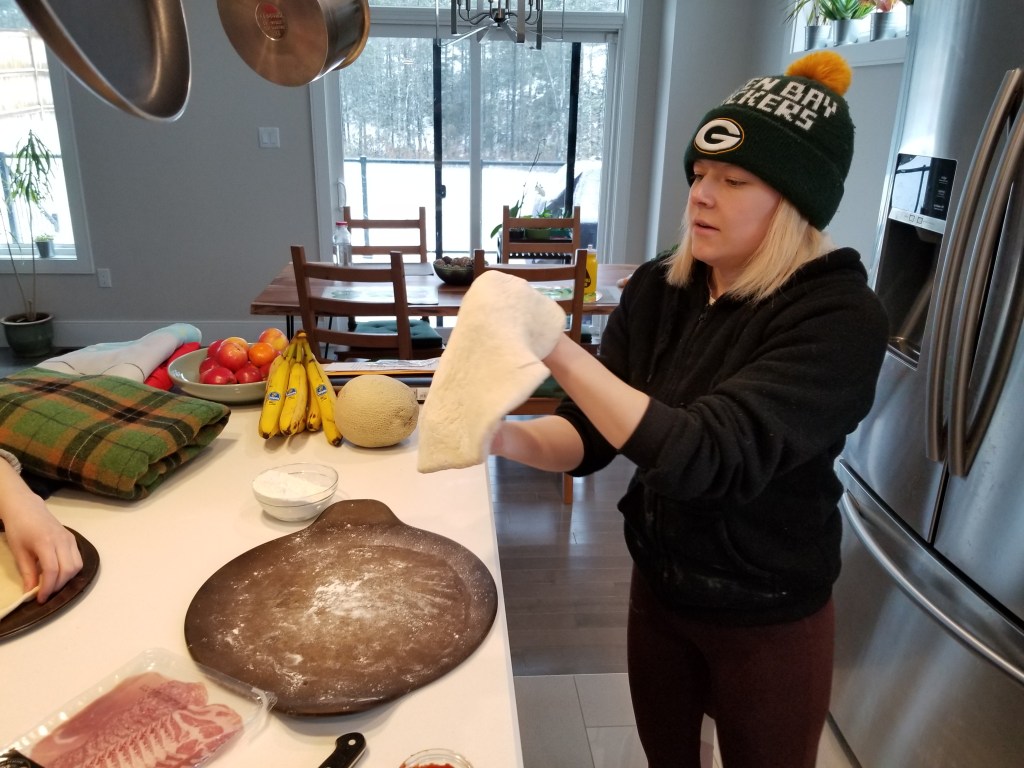 Eventually you can pick up the dough disc off the counter/pizza stone and use gravity to your advantage to help you stretch it out even more. While you do this, be sure to rotate your dough (like you are turning the steering wheel in your car) and that wll help keep your dough as circular as possible.